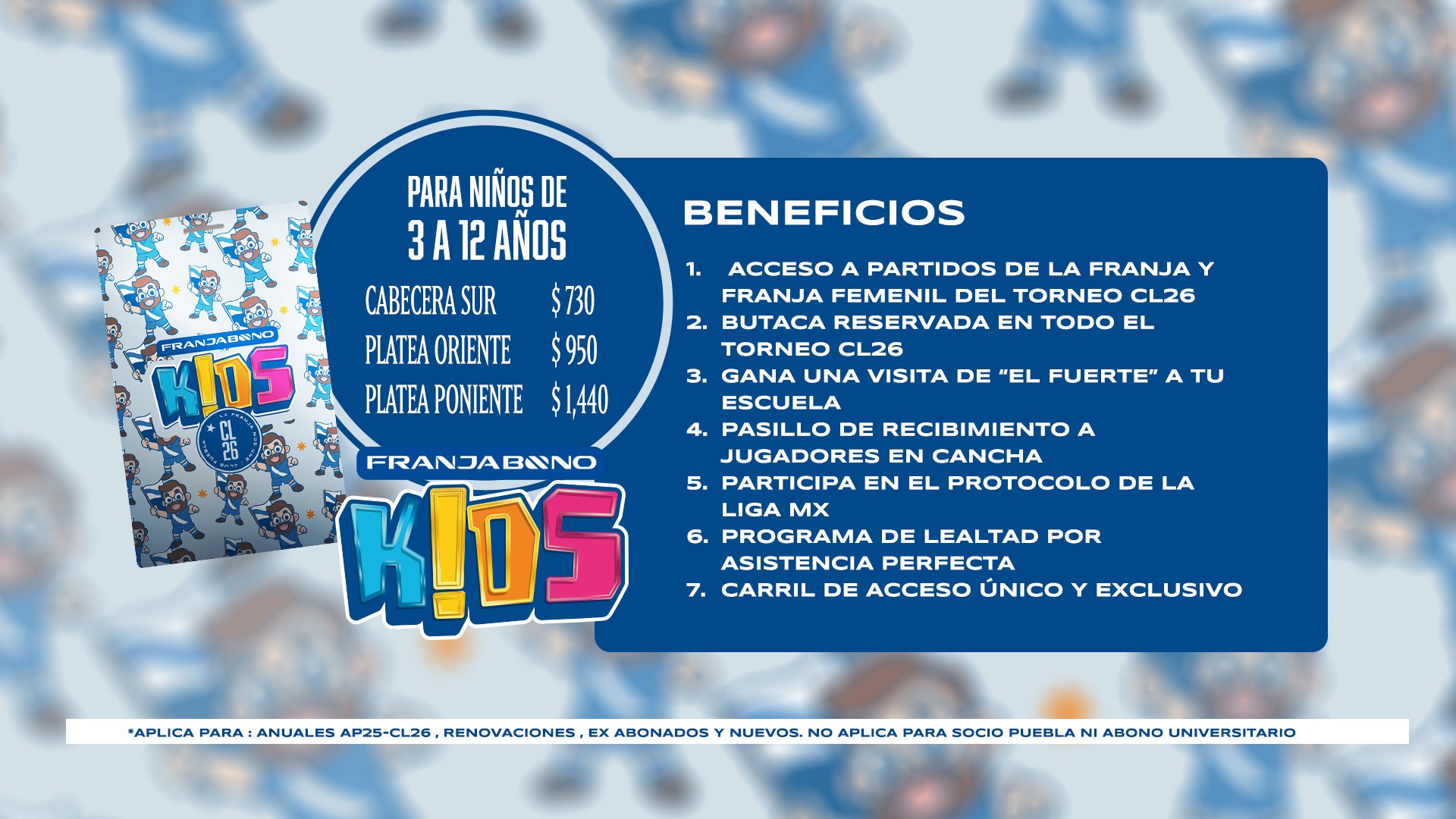 Es un beneficio exclusivo de tu Franjabono CL26 y es un abono  que le da acceso a todos los Mini Enfranjados hasta 12 años de edad a todos los partidos de la Liga MX que juegue el Club Puebla y el Club Puebla femenil en el Estadio Cuauhtémoc. La venta del Franjabono Kids es únicamente en puntos de venta físicos.
